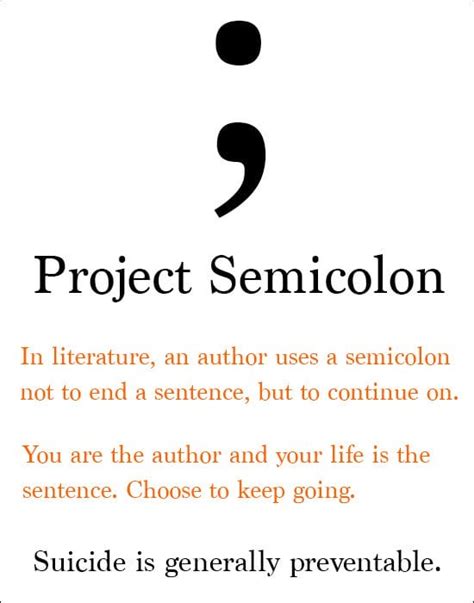 The semicolon is a punctuation mark that indicates a pause in a sentence, but not the end of the sentence. It is a symbol of continuation and the idea that the story is not over yet. In the context of mental health, the semicolon represents the struggles that people face, but also their resilience and determination to keep going.